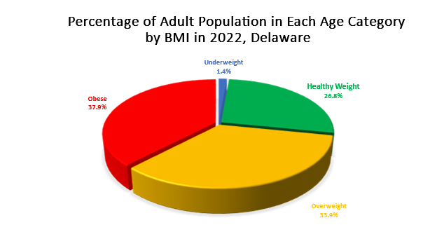 The survey asks respondents for their height and weight, from which BMI is calculated.  BMI, while not the ideal measure for individuals, is an appropriate measure for large population studies.  In 2022, 37.9 percent of Delaware adults reported being obese, and another 33.9 percent reported BMIs considered “overweight” — more than the recommended weight levels, but not obese.  About 26.8 percent of adults in Delaware reported weights in the recommended or healthy range. The pie chart below shows adult prevalence by BMI category: